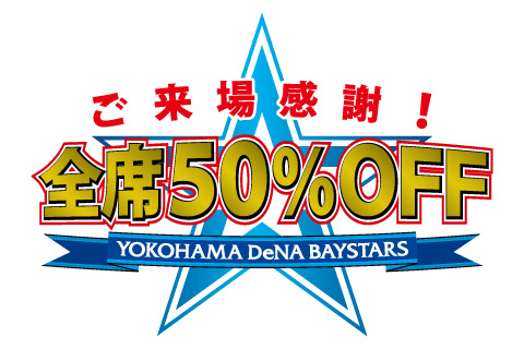 横浜DeNAベイスターズでは、10月8日(火)対阪神タイガース戦(18:00試合開始、横浜スタジアム、2013年度の最終戦[9/17(火)時点])において、『ご来場感謝!全席50%OFF』を実施いたします。