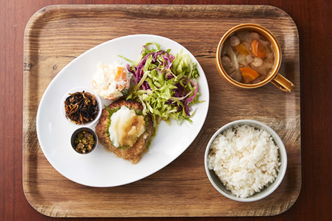 メイン「和風おろしハンバーグ」 副菜「ひじき煮/ポテトサラダ」 スープ「青星寮特製野菜スープ」 付け合わせ「青唐辛子漬け」 ライス(こしひかり)※大盛無料 ※ランチドリンク付き |