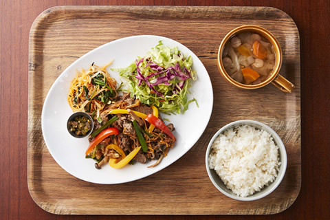 メイン「青星寮プルコギ」 副菜「特製ナムル(ほうれん草/もやし)」 スープ「青星寮特製野菜スープ」 付け合わせ「青唐辛子漬け」 ライス(こしひかり)※大盛無料 ※ランチドリンク付き |