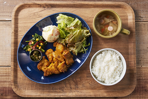 メイン「青星寮から揚げ(もも/むね)」 副菜「ひじき煮/ポテトサラダ」 スープ「青星寮特製野菜スープ」 付け合わせ「青唐辛子漬け」 ライス(こしひかり)※大盛無料 ※ランチドリンク付き |