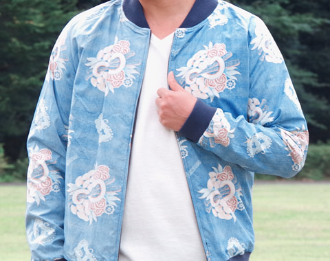 中側全面はリバースプリント(裏使い)の『薔薇(バラ)と銀杏(イチョウ)』アロハシャツ生地を贅沢に使用。リバーシブルに着用できるよう、ファスナーは回転レールに沿って引手が移動できるDUAスライダーを採用した究極に美しい逸品に仕上がりました。