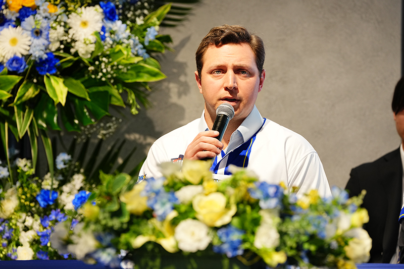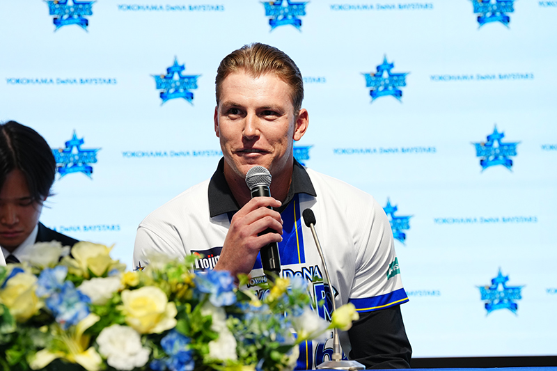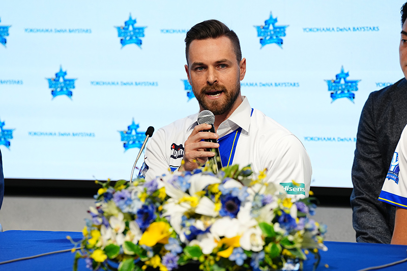 日本に来ることができてとても嬉しく、興奮しています。日本の野球はレベルが高いですし、最近ではメジャーへ挑戦する選手も増えています。そういった才能あふれるリーグで野球ができることを楽しみにしています。横浜は本当にきれいな街で、自分の好きな街だなと思っていますが、チームにも非常に良いカルチャーがあり、勝ちに貪欲な姿勢が僕のプレイスタイルと重なるのでベイスターズを選びました。自分も勝ちたいという思いが非常に強いです。日米の文化の違いも楽しみながらチームに貢献していきたいですし、チームメイトや監督・コーチから色々なものを吸収して貢献していきたいです。
