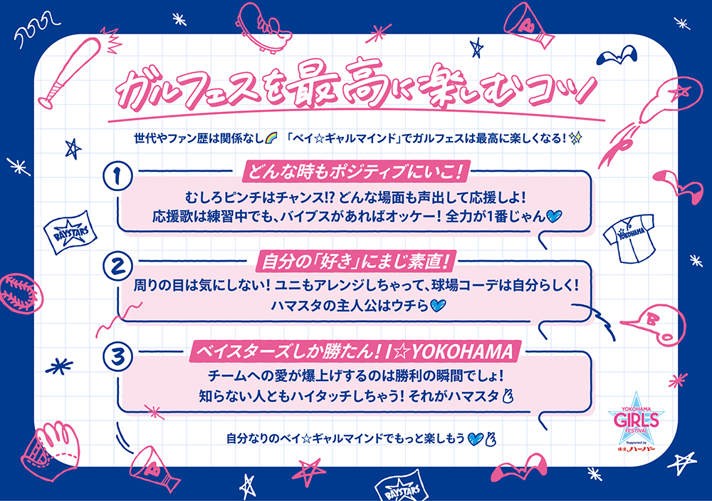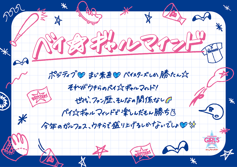 「ギャルマインド」とは、特定の外見や世代を指しているわけではなく、自分の「好き」に全力で突き進む最強のポジティブ精神のこと。このポジティブなマインドセットを横浜DeNAベイスターズ流にアップデートしたのが今年のガルフェスのテーマ「ベイ☆ギャルマインド」!