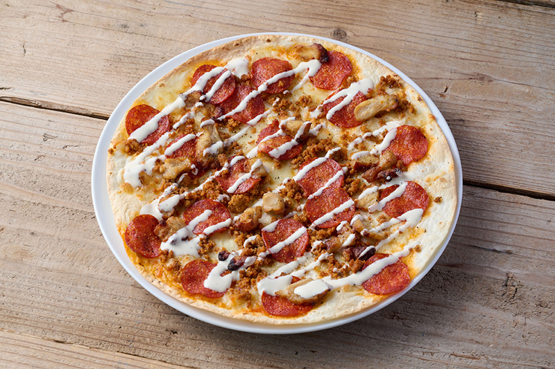 タコミート、ペパロニ、グリルチキンの3種類のお肉と仕上げにかけたブルーチーズソースが相性抜群!ボリューム満点のピザです。あらゆる球もお肉もミート打ち!熱々を召し上がれ