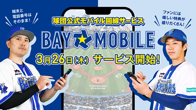 モバイル回線サービス「BAY☆MOBILE」のリリースが2026年3月26日(木)に正式決定いたしました。サービス開始時にあらためて、球団公式ホームページ等でお知らせいたしますので、続報をお待ちください!